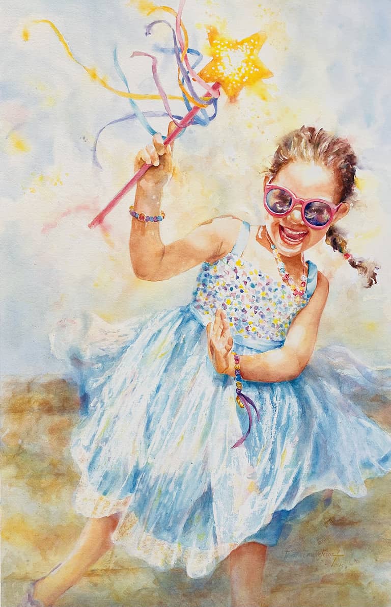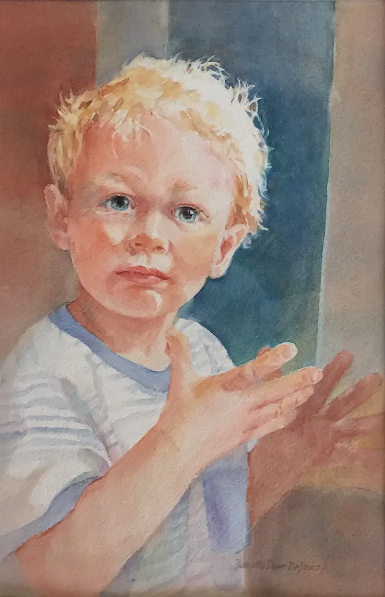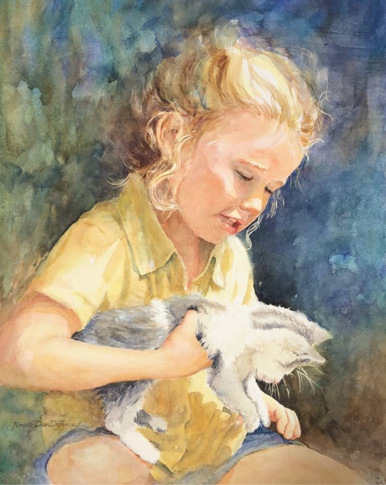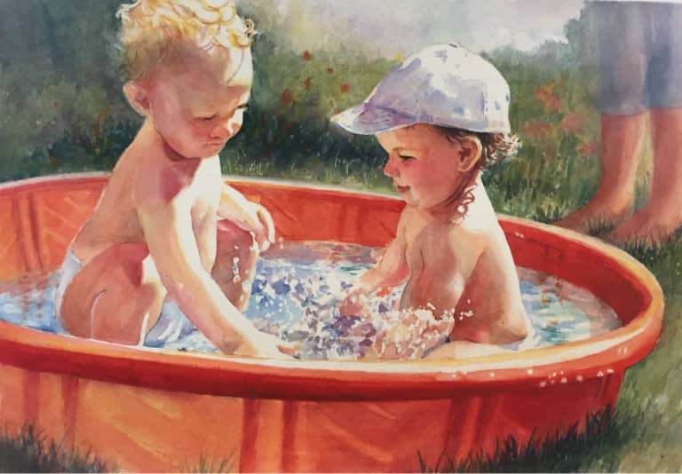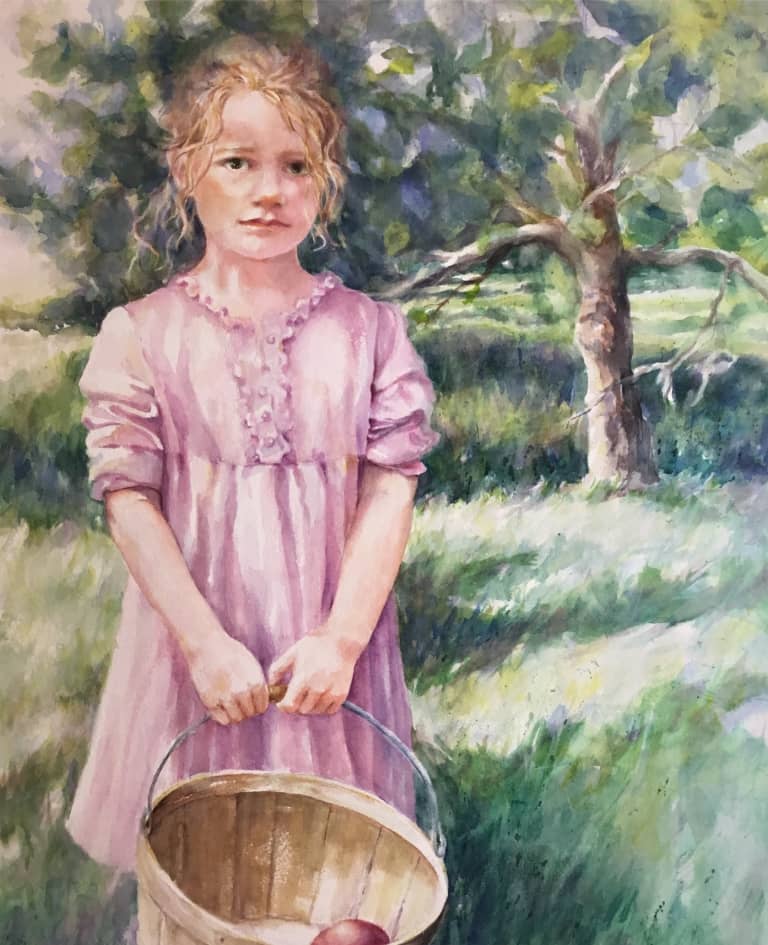 I especially enjoy painting children as they experience the wonders of life and God’s creations. We have six grandchildren and they are my muses. I know their personalities and what they are excited about. It is a joy to be able to express my creativity while capturing a snapshot of their lives in watercolor.